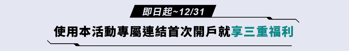 - 本活動新戶僅限透過本活動專屬開戶連結進件者,方可領取本活動福利一之贈品。透過此專屬開戶連結開戶的新戶,若同時符合其他活動新戶禮資格者,將不得重複領取其他活動之新戶禮,僅能領取本活動之新戶福利。