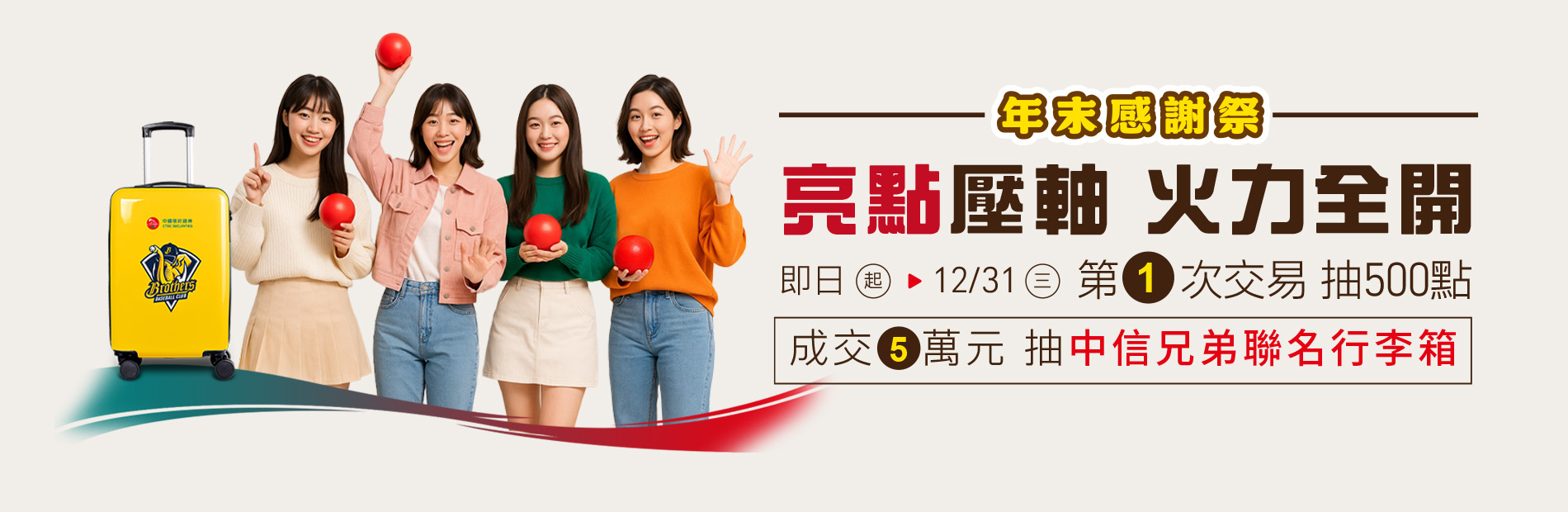 - 【亮點壓軸 體驗挑戰】各項任務不限開戶日期,凡本公司客戶於活動期間完成各項首次任務即可獲得一次抽獎機會,最多可獲得四次抽獎機會,將於活動結束30日內一次抽出得獎人,每一ID限獲獎一次,並於2026/1/31前完成抽獎並公佈得獎名單與撥放亮點點數,得獎人需於2026/1/30前完成亮點會員註冊,如無亮點會員將喪失得獎資格。