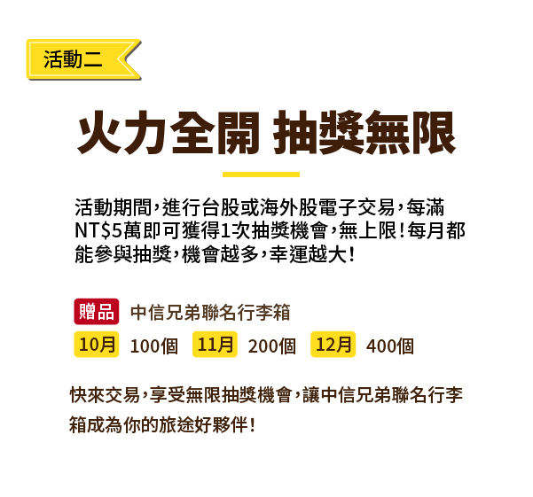 - 【火力全開 抽獎無限】獎項為活動期間按月抽出中信兄弟聯名行李箱合計700名(10月份100名、11月200名、12月400名),所有商品以實物為準,不得更換、挑款或折抵現金贈品禁止販售,寄送情形以實際出貨為主。