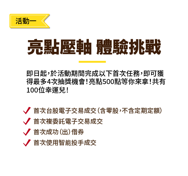 - 本活動若係以參加者於本公司之實際成交資料為統計依據,投資有價證券皆具有一定之風險,參加者應事先瞭解相關法令及風險預告書,不得以不知其規定為由,提出任何主張。