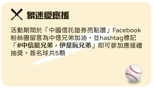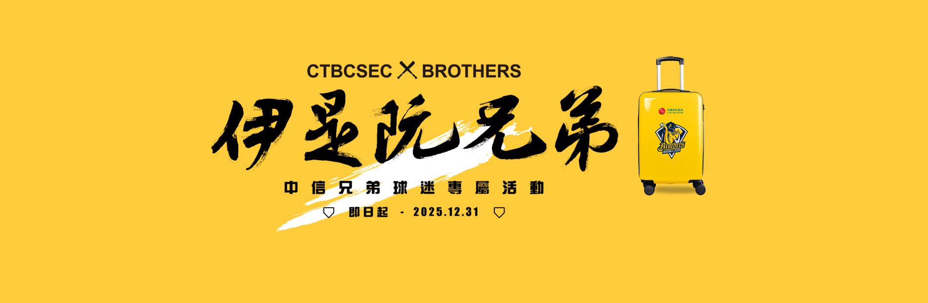 - 象迷愛應援活動自2025年10月15日起登場,參加者須於「 中國信託股市情報讚」Facebook粉絲團指定活動貼文留言,並加註hashtag「#中信挺兄弟,伊是阮兄弟」始具資格。活動不需另行報名,本公司將統一於2025年11月20日以系統程序就符合抽獎資格之參加者名單中抽出得獎名單,每位參加帳號僅能中獎一次。獎項為中信兄弟簽名球5顆,將於2025年11月30日前寄出,獎品以實物為準,恕不挑款、不指定球員、亦不得折現。如遇不可抗力因素(如颱風)致使抽獎或寄送無法如期辦理,相關作業將自動順延至次一工作日。