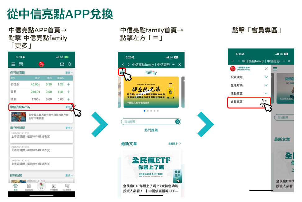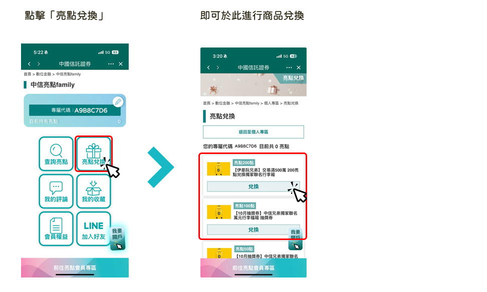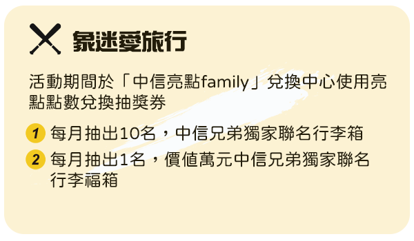 - 象迷愛旅行活動期間自2025年10月1日至12月31日止,參加者可於亮點family兌換中心使用 50點亮點點數兌換行李箱抽獎券,使用100點亮點點數兌換行李福箱抽獎券。抽獎券將於活動截止後下架,本公司將於抽獎券上架之次月月底前以系統程序完成抽獎,並於2026年1月10日前公布中獎名單及通知得獎者。獎項包括每月抽出10名中信兄弟聯名行李箱與1名聯名行李福箱,獎品以實物為準,恕不更換或折抵現金。