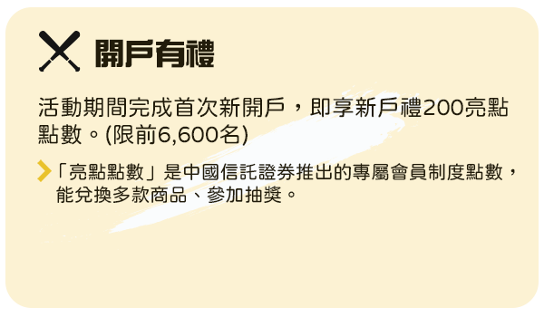 - 開戶有禮贈品為200點亮點點數,將於開戶完成次月20日前批次發放,每個身分證字號限領一次。2025年10月完成開戶者將於11月20日前發送,11月完成開戶者將於12月20日前發送,12月完成開戶者將於 2026年1月20日前發送。參加者應配合本公司開戶作業所需,提供或補足相關文件,如因延誤或資料不齊致未能完成開戶或取得資格,本公司恕不負責。