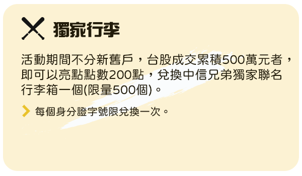 - 獨家行李限量500個,必須使用200亮點點數於中信亮點family兌換中心兌換商品卡,並符合於活動期間內累積達500萬元台股成交金額始符合兌換資格。若未達交易量門檻,兌換將取消並於活動結束後 60 個工作天內退還點數。商品將依活動期間內,台股不限標的成交金額累積滿500萬元達成順序發送,數量有限,兌完為止,且所有商品以實物為準,不得更換、挑款或折抵現金。