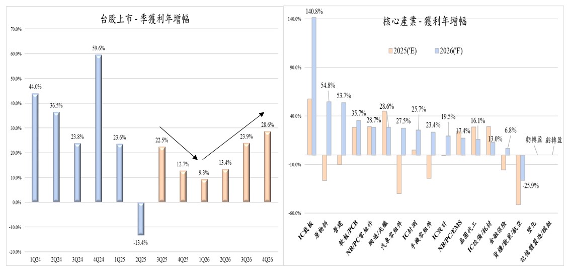 台股穩健高殖利率公司,常見產業包括「消費性電子零組件、電子通路、紡織、建材營建租賃、鋼鐵、塑膠塑化製品、資訊服務、金融銀行等」,其中以外銷貿易比重最高,尤以電零組件與電子通路為最,故而上半年在對等關稅與台幣強升的雙重夾擊下,多數公司出現獲利小幅衰退情況,再加上AI獨強而造成明顯資金排擠效應,不過根據目前內外投資機構平均預估顯示,明年台股多數產業將重返成長軌道,並呈現雙位數復甦或維持成長,其中不乏沉寂多時的傳產類股,諸如原物料、營建、汽車零組件、消費性電子,塑化塑膠等,相關概況可參考下圖。