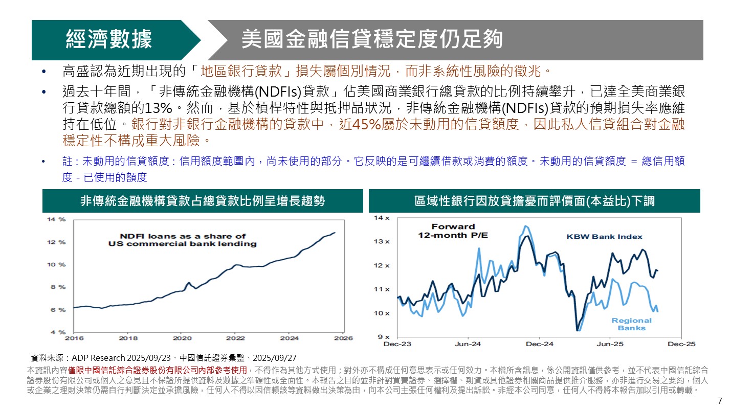 - 過去十年間,「非傳統金融機構(NDFIs)貸款」佔美國商業銀行總貸款的比例持續攀升,已達全美商業銀行貸款總額的13%。然而,基於槓桿特性與抵押品狀況,非傳統金融機構(NDFIs)貸款的預期損失率應維持在低位。銀行對非銀行金融機構的貸款中,近45%屬於未動用的信貸額度,因此私人信貸組合對金融穩定性不構成重大風險。