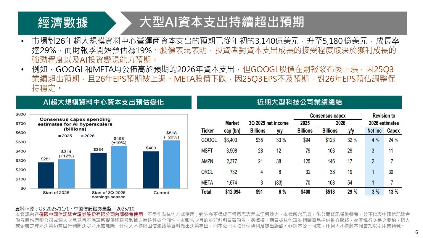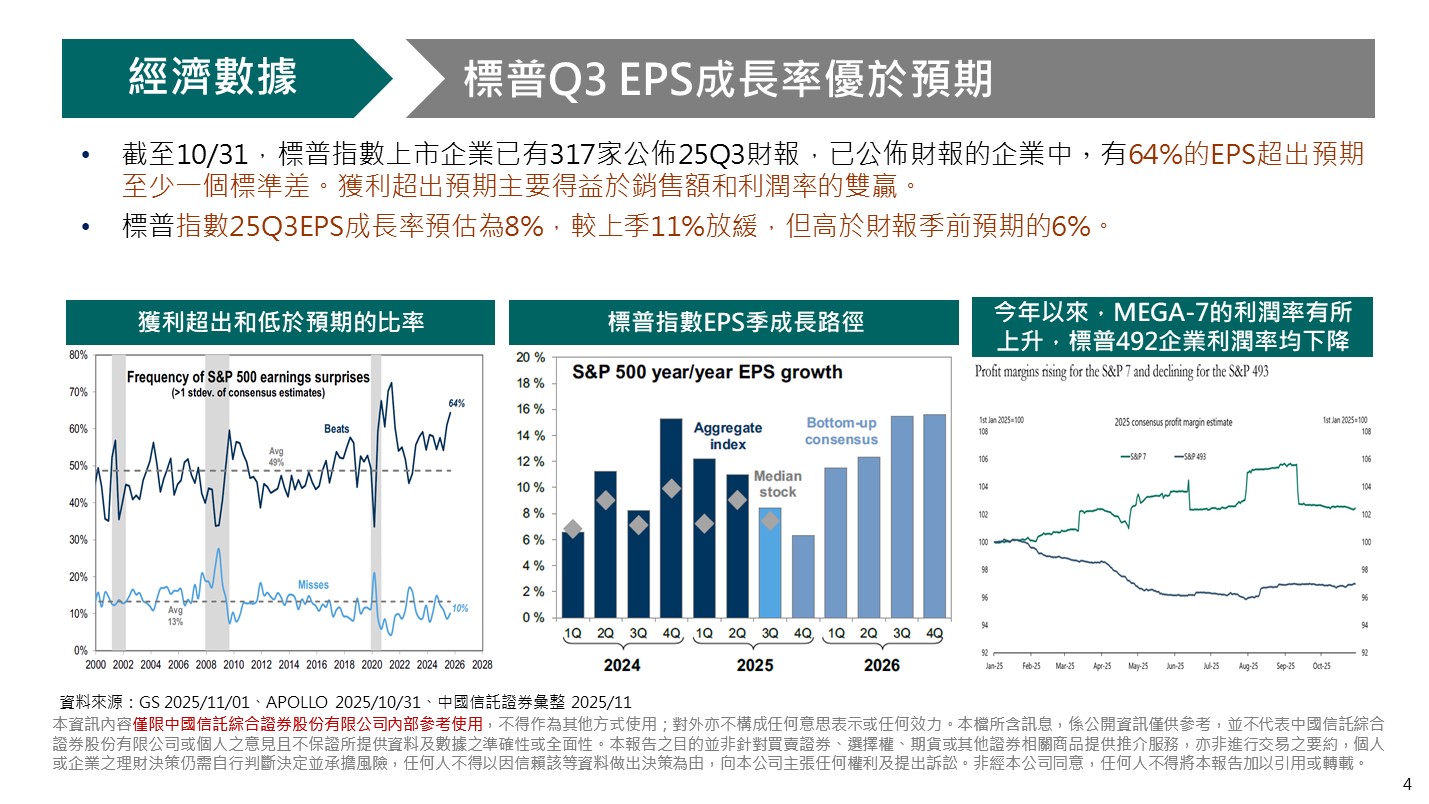 - 標普指數25Q3EPS成長率預估為8%,較上季11%放緩,但高於財報季前預期的6%。