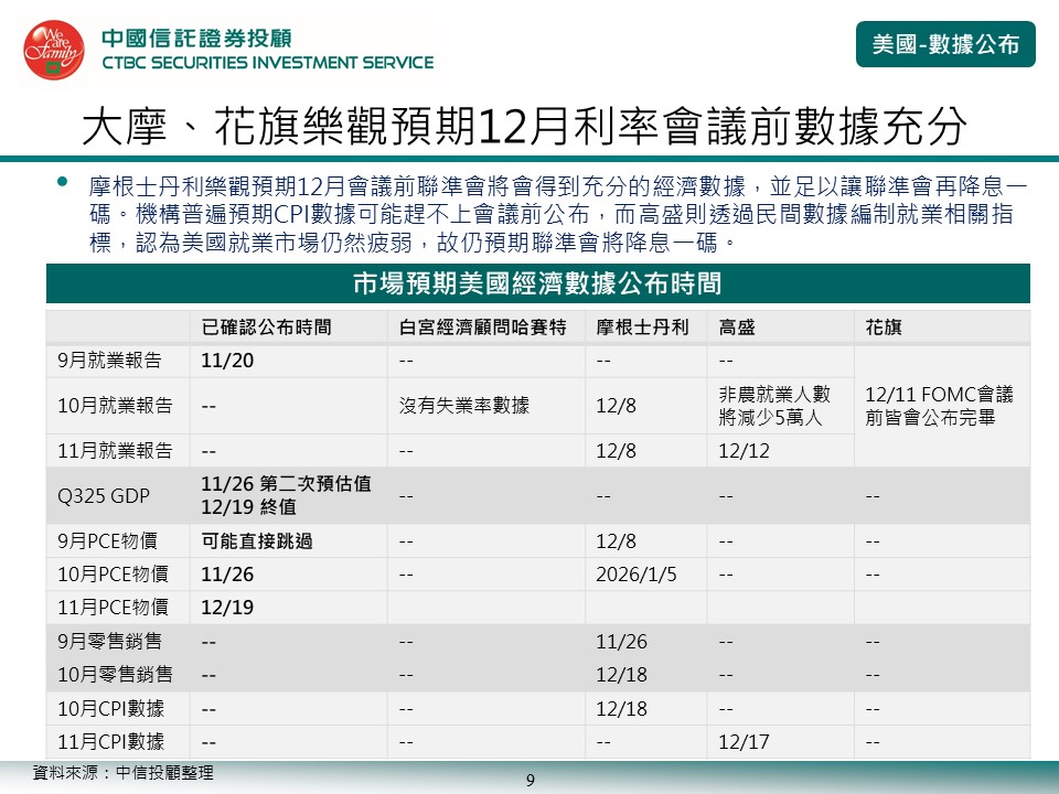 - 美國政府將陸續公布延遲經濟數據,大摩、花旗樂觀預期12月利率會議前數據充分。