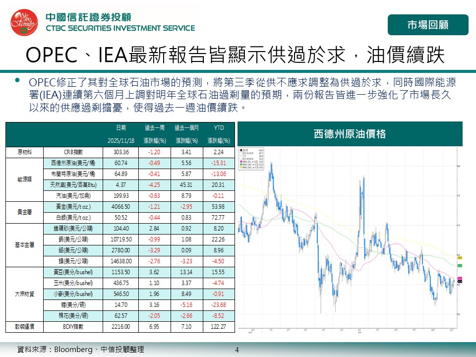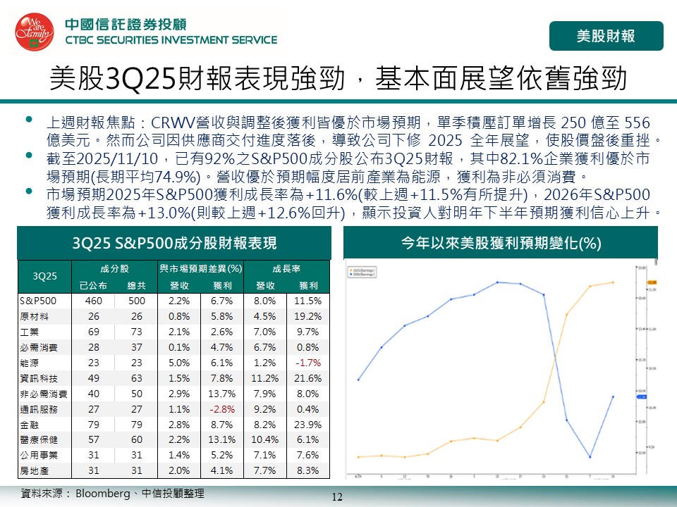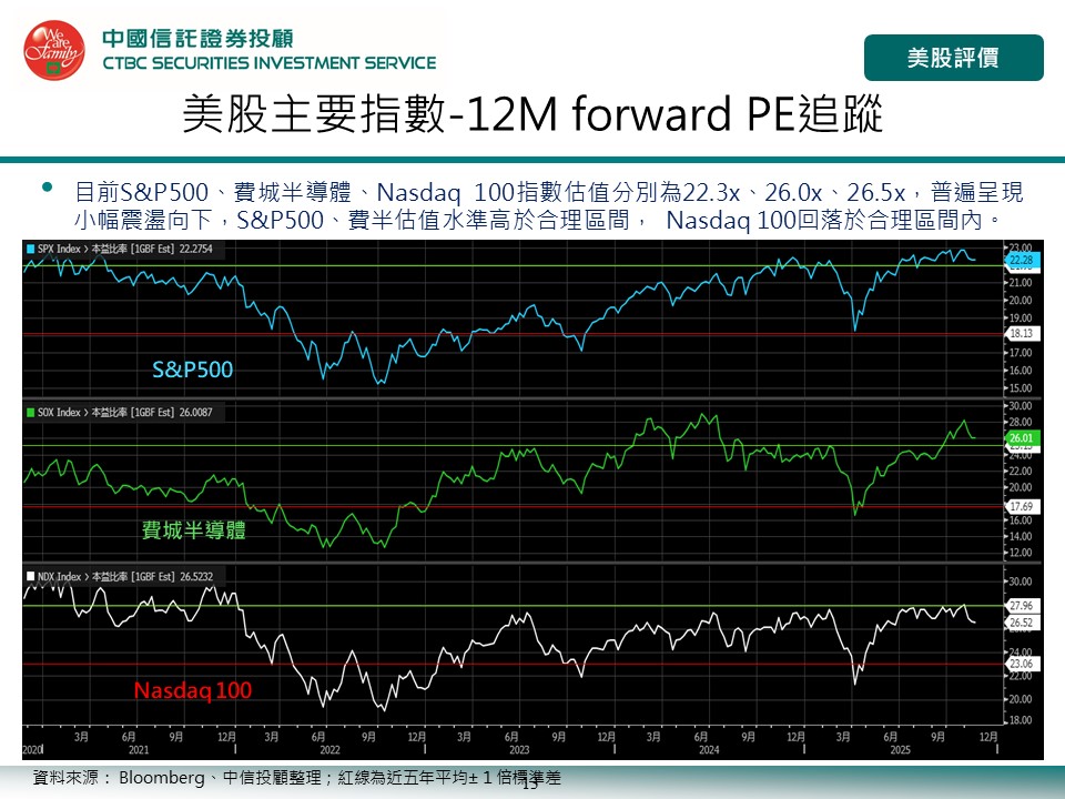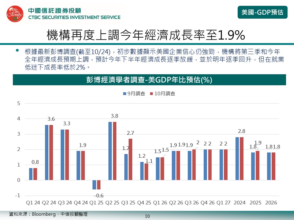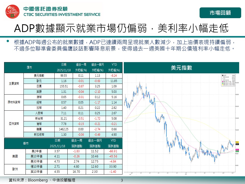 截至11/14利率期貨隱含市場預期12月將維持利率不變,降息延至明年1月,但市場仍預期明年6月和9月將各降一碼,代表降息只是延後,並非降息循環結束,故預期美國十年期公債殖利率持續位於3.9%~4.2%區間。
