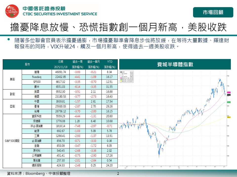 隨著多位聯會官員表示擔憂通膨,市場擔憂聯準會降息步伐將放緩,在等待大量數據、輝達財報發布的同時,VIX升破24,觸及一個月新高,使得過去一週美股收跌。