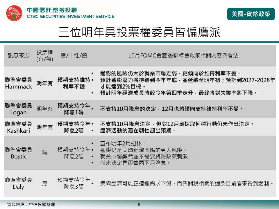 - 具投票權委員中明確支持12月降息僅兩位,三位明年具投票權委員皆偏鷹派。