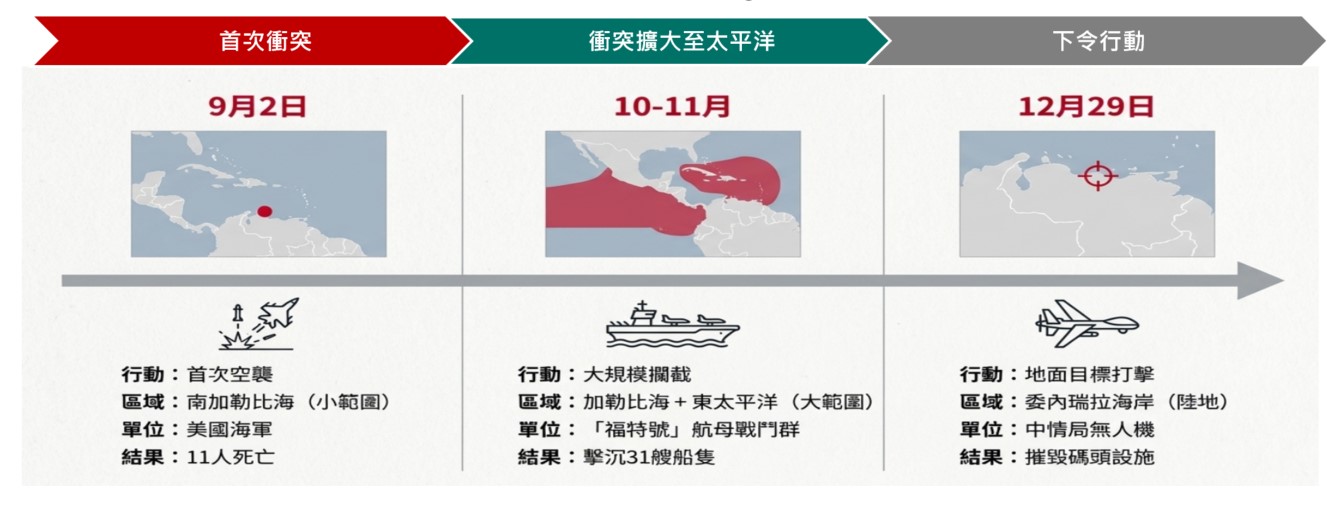 2025 年下半年,美國以打擊販毒集團「阿拉瓜火車」(Tren de Aragua)為由,在加勒比海發動多次軍事行動: