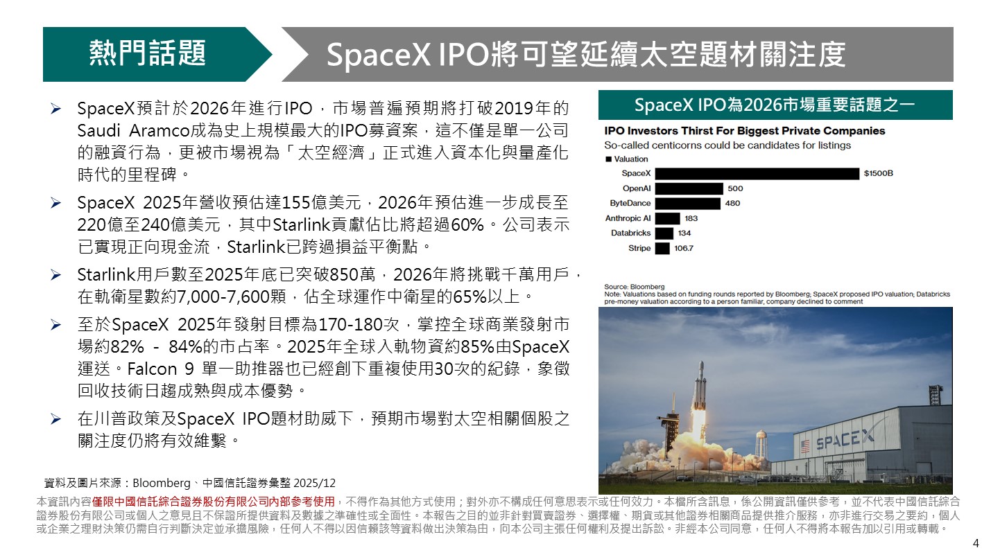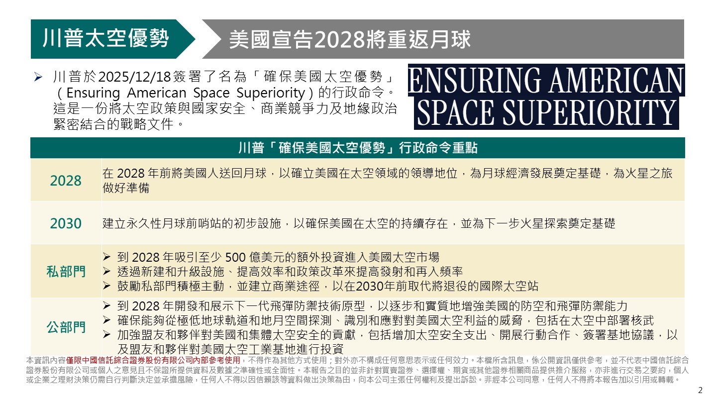 - SpaceX預計於2026年進行IPO,被市場視為「太空經濟」正式進入資本化與量產化時代的里程碑。在川普政策及SpaceX IPO題材助威下,預期市場對太空相關個股之關注度仍將有效維繫。