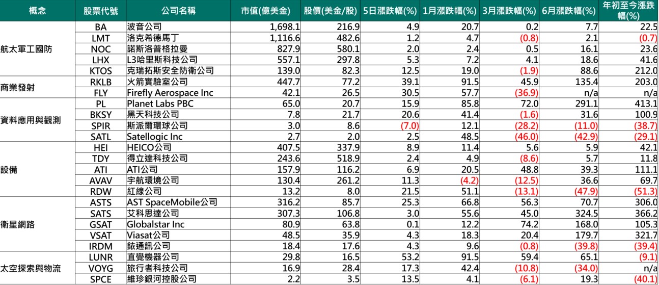 - 考量政策實際進度仍待觀察,個別基本面獲利之差異,現階段選股上仍建議穩健均衡配置,傳統大型股Lockheed Martin(LMT) 、新興勢力Intuitive Machines(LUNR)及Rocket Lab (RKLB)等均可留意。