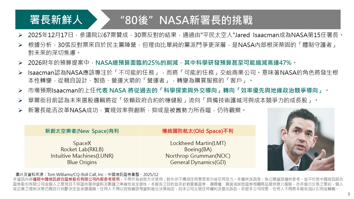 - 市場關注新署長Isaacman引領下之NASA未來走向,亦將牽動未來選股邏輯。