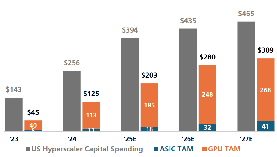 AI浪潮席捲全球,數據中心的運算需求呈指數級增長,「帶動全球ASIC產業邁入快速成長階段。根據日本Business Research預測,客製化ASIC市場規模將從2024年的1,998億美元,以8.9%的年複合成長率(CAGR)成長,預計2033年達4,305億美元。從先進封裝需求來看,根據瑞銀(UBS)預估,至2026年超大規模企業的ASIC需求將以70%的年複合成長率增長,並占當年CoWoS需求的36%;ASIC的CoWoS晶圓總消耗量於2025年及2026年將分別成長52%與80%,達173千片與311千片,顯示整體產業成長趨勢明確。在先進封裝技術推動下,ASIC已成為驅動半導體供應鏈升級的核心動能。根據預測,客製化ASIC於AI晶片市場的占比將在2027年擴大至30%,年複合成長率約30%,顯示其角色已從單純硬體選項,躍升為企業AI策略的關鍵組成。