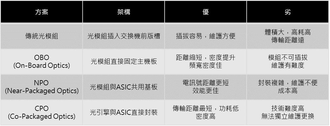 隨著ASIC於AI運算的廣泛應用,資料中心傳輸效能成為新瓶頸。傳統電訊號傳輸已難以滿足AI運算對頻寬與能耗的需求,促使共同封裝光學(CPO, Co-Packaged Optics)技術應運而生。CPO並非傳統光模組的升級,而是針對AI與高效能運算(HPC)架構的根本性改革。其核心為將光學元件與電子晶片直接整合封裝於同一基板,有效突破傳統電氣傳輸的物理限制。