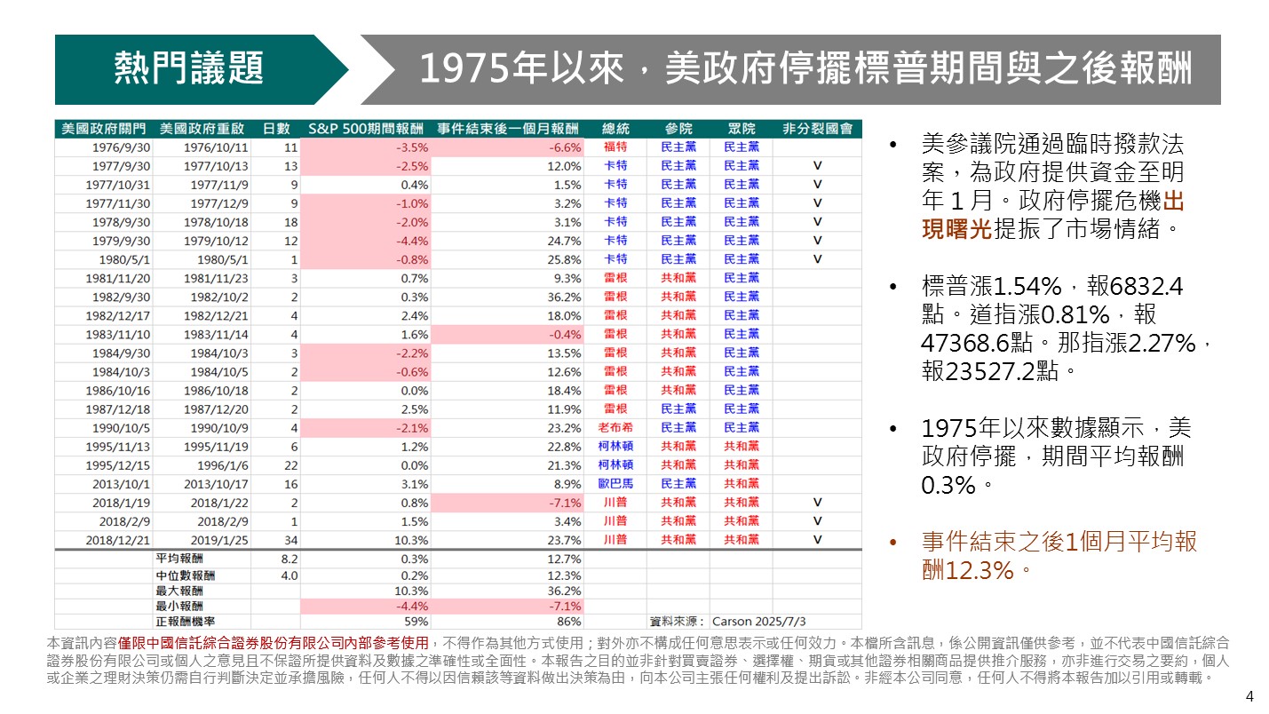 美國參議院通過臨時撥款法案,解決政府停擺問題,提振市場情緒。標普漲1.54%,道指漲0.81%,那指漲2.27%。自1975年以來,政府停擺期間平均回報為0.3%,停擺結束後1個月平均回報12.3%。