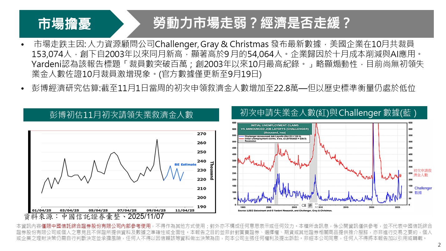 美國10月裁員達153,074人,創2003年以來同月新高,較9月的54,064人大幅增加。企業解釋為成本削減與AI應用所致。不過,Yardeni認為該報告標題過於煽動,因為官方失業金數據(截至9月19日)並未顯示裁員激增。彭博估算,截至11月1日,初次申領失業金人數增至22.8萬,但仍處於歷史低位。