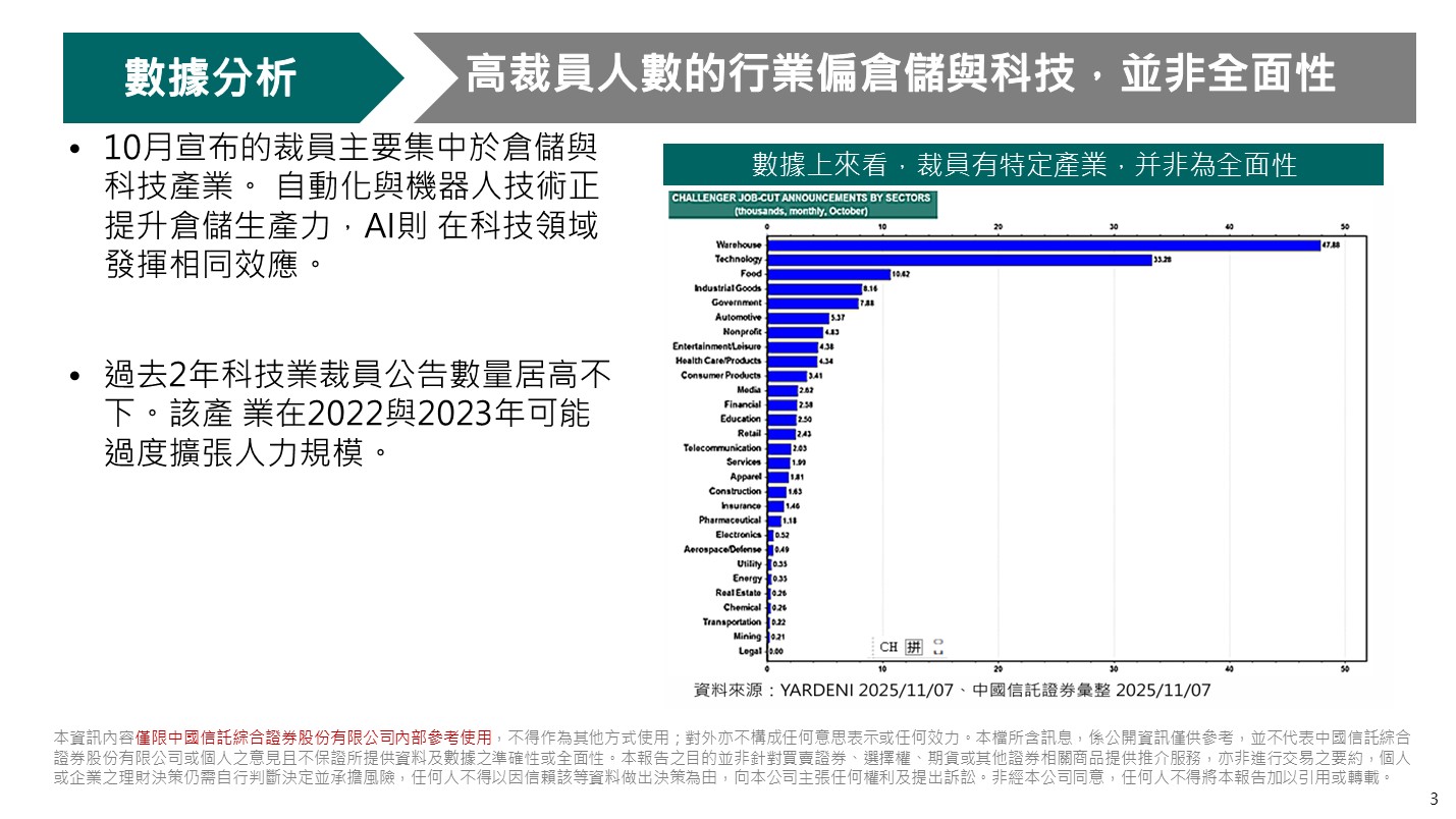 10月裁員主要集中在倉儲與科技產業,倉儲自動化與AI技術提升了生產力,導致科技業裁員數量持續上升。過去兩年,科技業可能過度擴張人力。