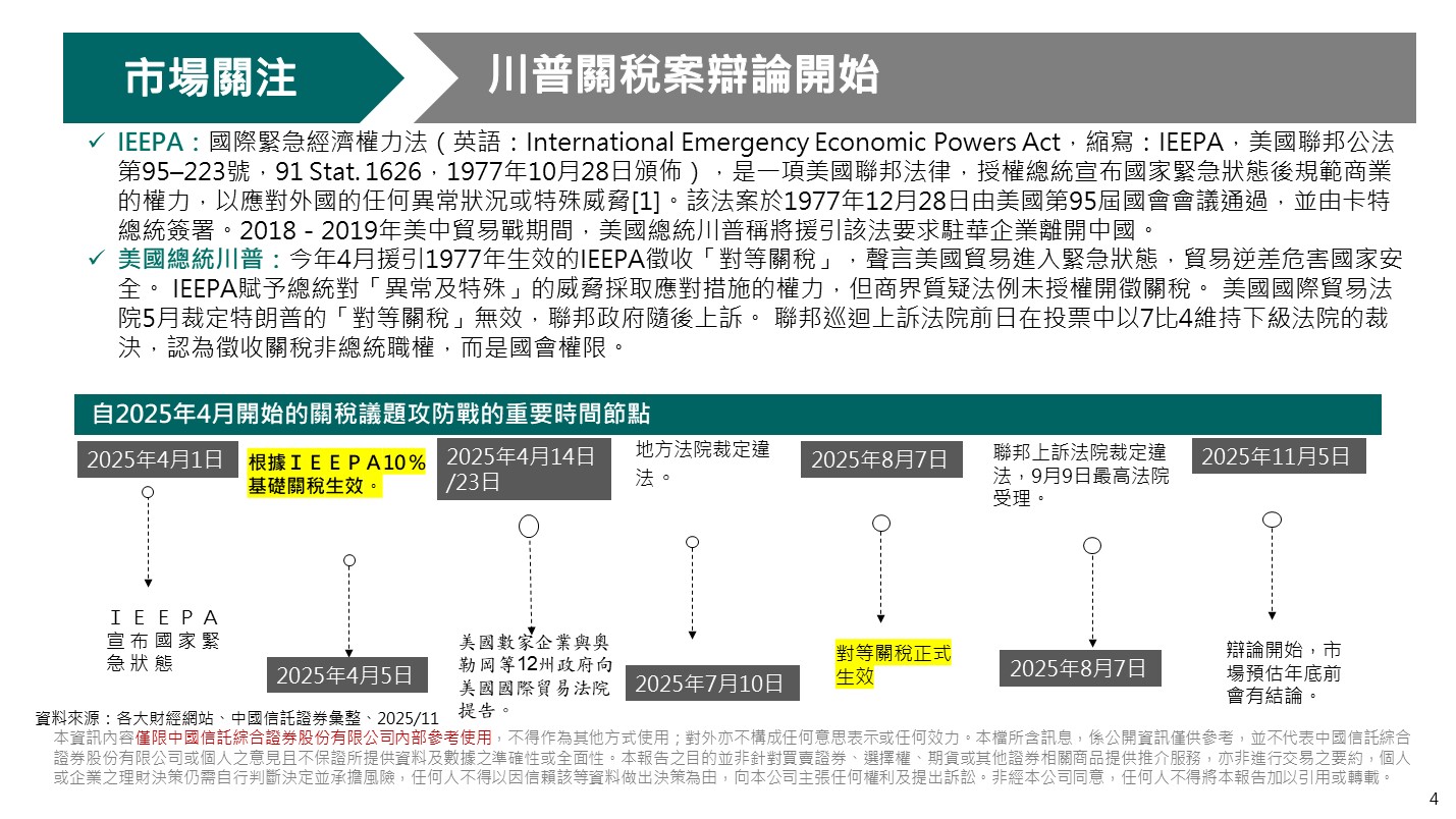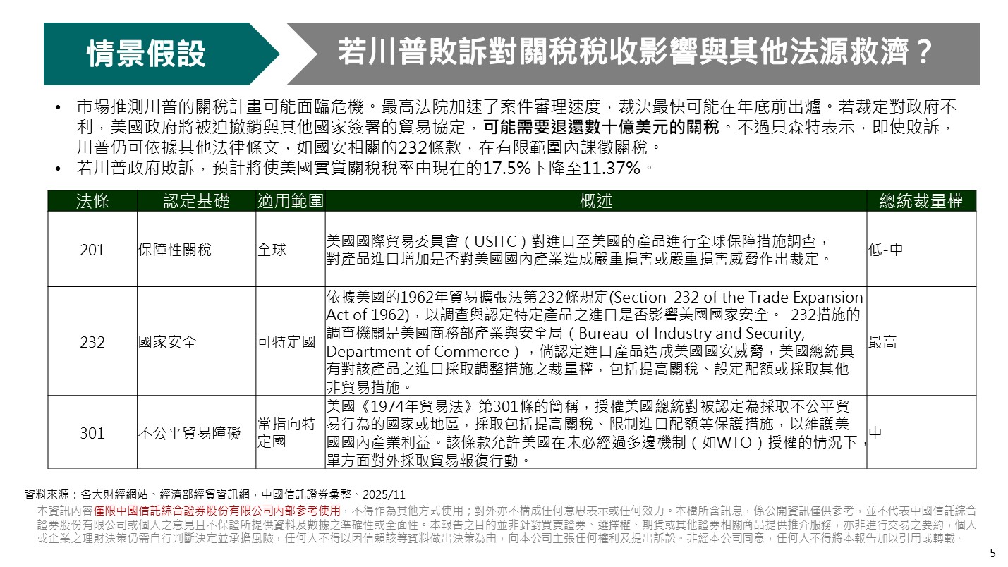 市場擔心川普的關稅計劃可能遭遇挑戰,最高法院將加速審理,最早年底有裁決結果。若對政府不利,將需撤回與其他國家的貿易協定,並可能退還數十億美元關稅。即使敗訴,川普仍可依據國安法232條款在特定範圍內徵收關稅。若敗訴,美國關稅稅率可能從17.5%降至11.37%。