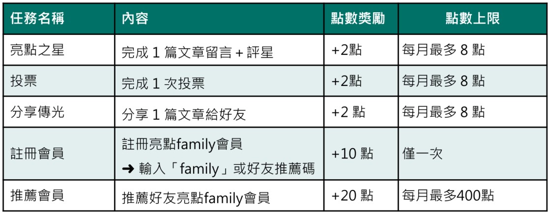 每日完成留言、分享等互動任務,就能獲得亮點點數。