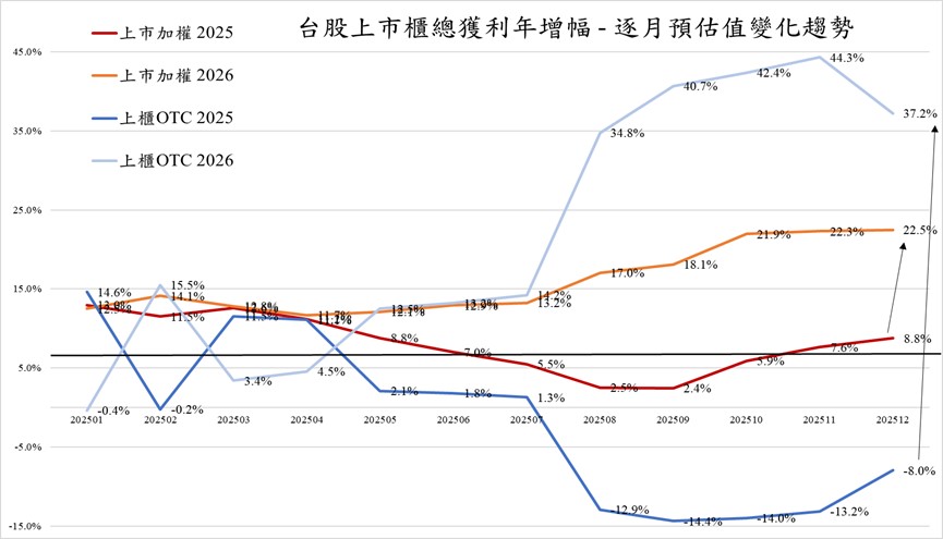 台股上市櫃預估獲利逐月變化趨勢