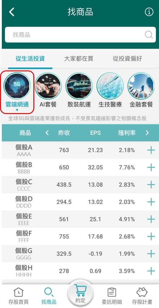- 中信亮點app,台股定期【雲端網通餐】