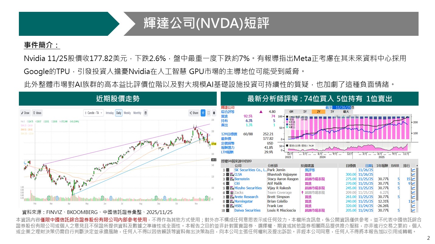 11 月下旬,AI 指標股 Nvidia 股價明顯回調,11/25 收在 177.82 美元,單日下跌 2.6%,盤中更一度重挫約 7%。市場情緒轉弱,主要受到外媒報導指出 Meta 正評估在未來資料中心導入 Google TPU,而非全面依賴 Nvidia GPU。此消息讓投資人開始擔憂 Nvidia 在 AI 晶片市場的主導地位可能面臨挑戰。