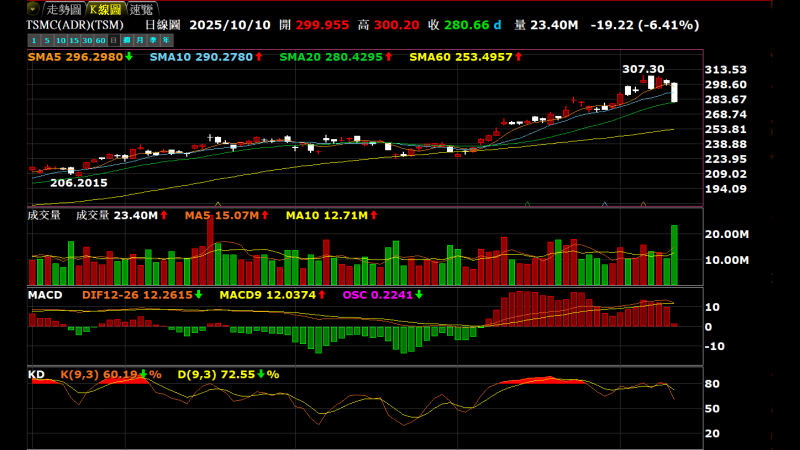 科技五巨頭全面走弱,半導體族群成為此次風暴中心, 台灣相關ADR同步受壓,台積電下跌6.41%、日月光下跌5.38%、聯電下跌4.01%。