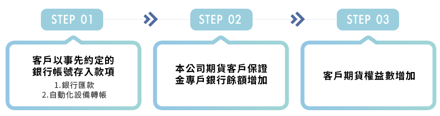 - ①客戶須以事先約定的銀行帳號入金﹝每一種幣別最多可約定3個銀行帳號﹞。未約定者,以出金帳號為約定之入金帳號。